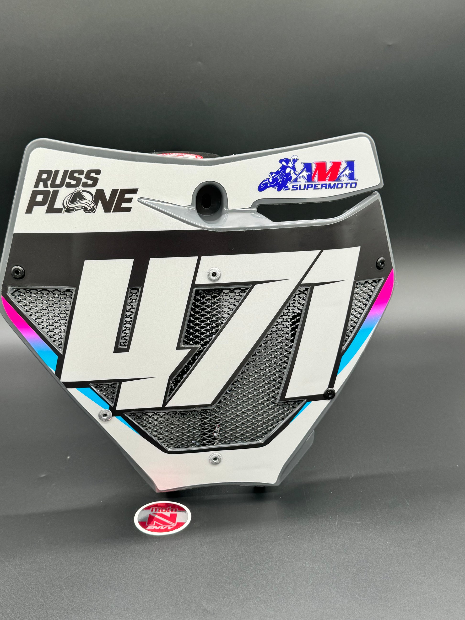 Vented front number plate. Custom handmade vented front number plate by Moto Envy. You send us your New Plate and Graphic (installed or uninstalled) and we will vent it and return it to you.